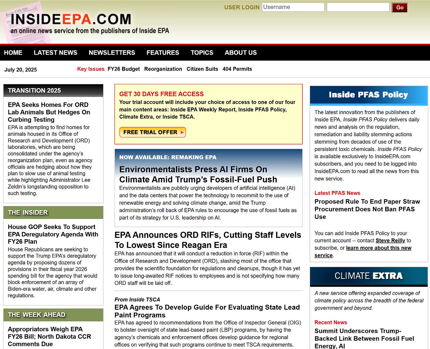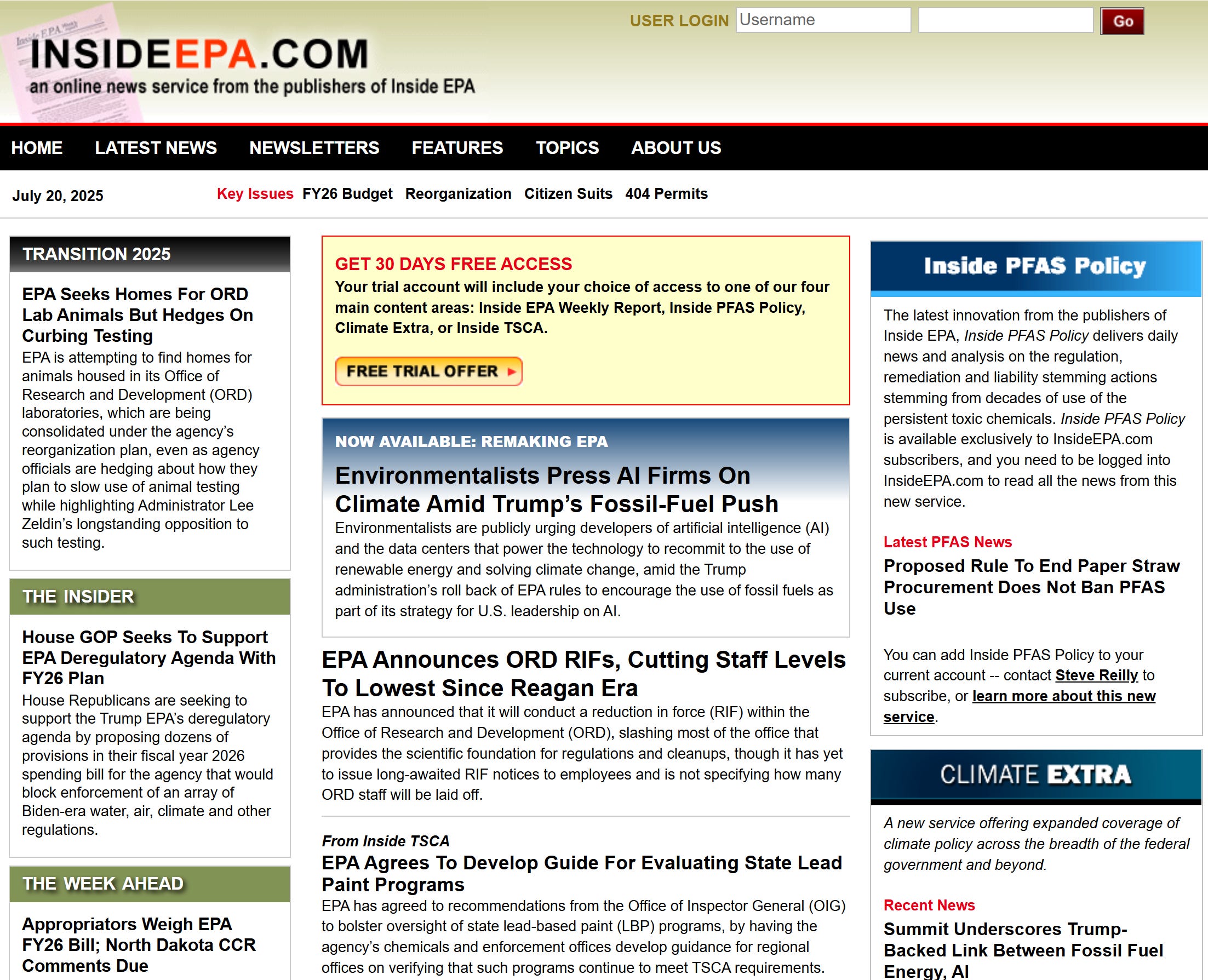 And there are intriguing tidbits to be found on the InsideEPA.com site at this moment. Seeking new homes for ORD laboratory test animals, but hedging on whether animal testing will actually be halted. ORD staff learning about the upcoming RIF from the EPA press release. Staff levels will be the lowest since the Reagan area. And the planned 2026 budget provisions to support the deregulatory agenda and block enforcement of Biden-era regulations.