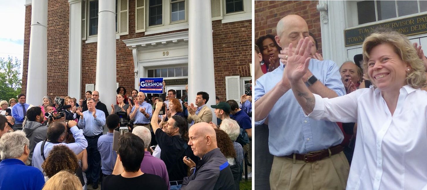.Top – A couple hundred Dems in Smithtown; we’d just finished the NY-1 and NY-2 primaries in June 2018, and rallied to unite behind our chosen candidates. (Happy to have found a pic of myself waving thank-you for the thank-you’s after shaking Perry’s hand. Still unemployed, I canvassed for Perry every week for the next three months. Zeldin won in the general election, unfortunately.)