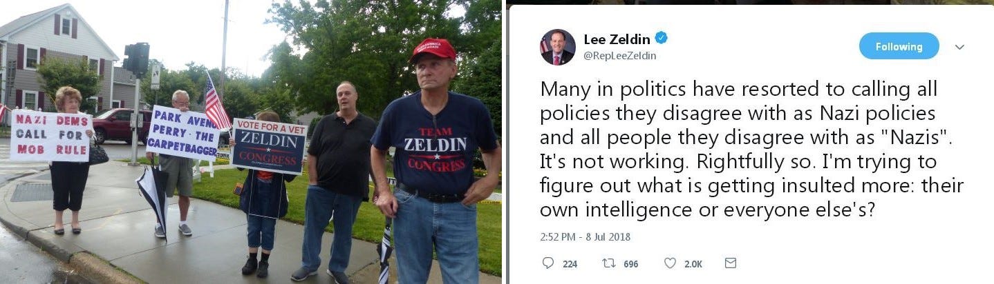 Bottom – five very happy Zeldin supporters hanging at the edges of our event. Especially love the earnest lady with the capri pants and sparkly handbag holding her sign that says “NAZI DEMS CALL FOR MOB RULE.” Ten days later, Zeldin’s Twitter account complained something something somebodies keep calling people Nazis. And what was Zeldin actually doing, during the Dems’ Unity Rally on June 28th? He was within a mile of us at the Smithtown Elks Lodge, kicking off a fundraiser with disgraced white supremacist Sebastian Gorka.